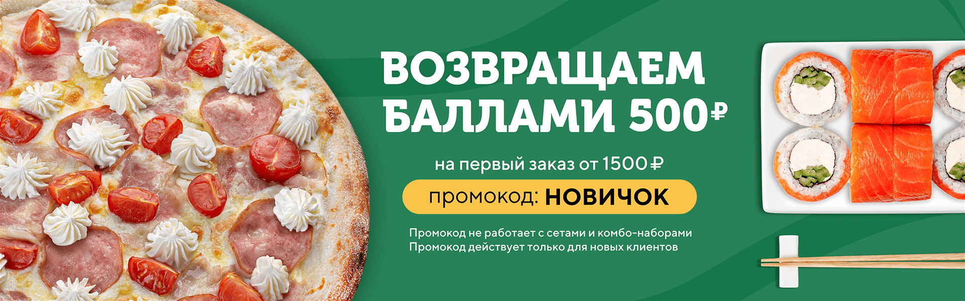 Начисляем всем новым клиентам 500 приветственных баллов на карту лояльности, при минимальном заказе от 1500 рублей.